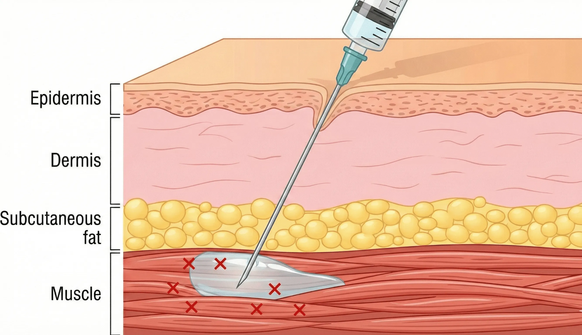 아래 그림에서 주사 바늘이 가장 깊은 근육층(Muscle)까지 도달하여 약물을 주입하고, 근육에 X 표시가 되어
