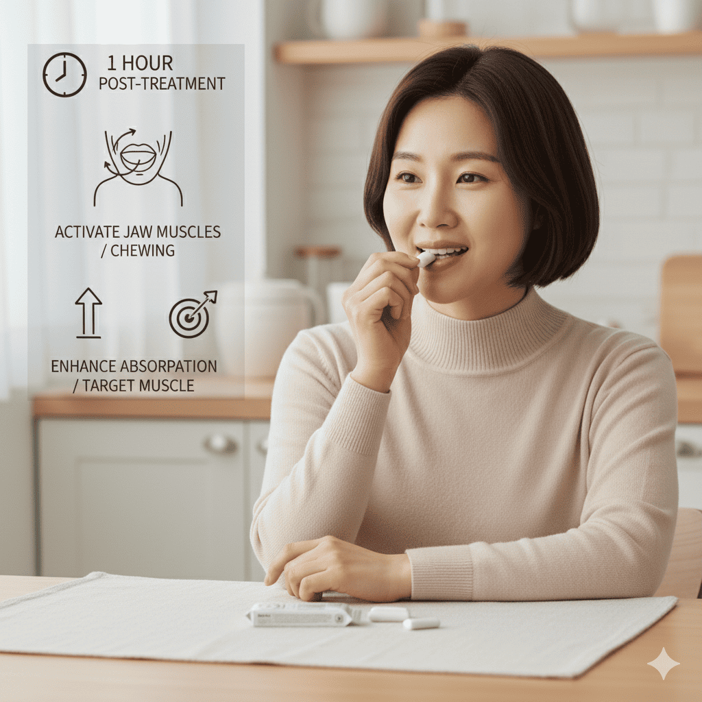 턱 보톡스 시술 직후 1시간 정도 가볍게 껌을 씹는 등 저작 운동을 해주면 약물이 타겟 근육(교근)에 더 잘 흡수될 수 있습니다.