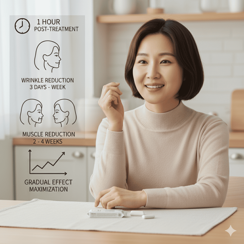 주름 개선 효과는 시술 후 약 3일~1주일부터, 근육 축소 효과는 2~4주에 걸쳐 서서히 나타나 최대치에 도달합니다.