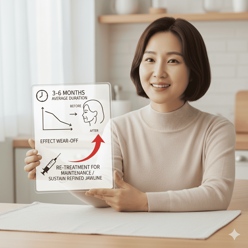 효과는 평균 3~6개월 지속되므로, 주기적인 시술을 통해 근육의 재발달을 억제하고 세련된 라인을 꾸준히 유지하는 것을 권장합니다.