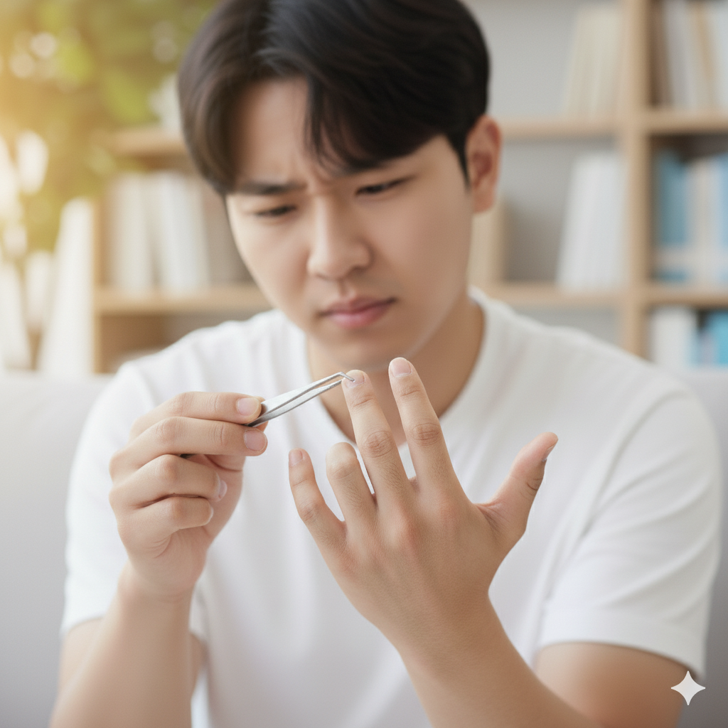 한포진은 손가락, 손바닥, 발바닥에 투명하고 작은 물집이 무리 지어 발생하는 비염증성 수포성 질환입니다.